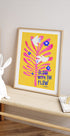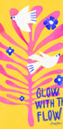 Iloinen ja motivoiva juliste, jossa kaksi valkoista kyyhkystä lentää voimakkaiden vaaleanpunaisten lehtien ja sinisten kukkien keskellä kirkkaalla keltaisella taustalla. Leikkisä typografia "Glow with the Flow" lisää kohottavan viestin positiivisuudesta ja ilosta. Täydellinen tuomaan hyvän tunnelman mihin tahansa huoneeseen.