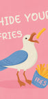 Hassu ja humoristinen kuva lokista, joka varastaa perunoita, leikkisällä tekstillä "Piilota perunat". Tämä värikäs juliste tuo rantatunnelmaa ja röyhkeää charmia kotiin. Se sopii täydellisesti keittiöön, lastenhuoneeseen tai sisustukseen, jossa on huumoria ja kevyttä designia.
