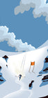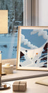 Snowy Mountain vangitsee talven sykkeen: retrohenkinen hiihtojuliste, jossa pujottelukilpailija kiihtyy alas häikäisevän valkoista vuorenrinnettä. Terävät siniset sävyt, dramaattiset pilvet ja rosoiset huiput luovat korkean alppiraikkauden, seikkailun ja klassisen eurooppalaisen hiihtoilmapiirin tunteen. Täydellinen herättämään matkaunelmia ja halu lumisiin kaarteisiin.
