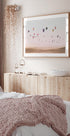 Unenomainen valokuva värikkäistä kuumailmapalloista, jotka kelluvat kultaisten hiekkadyynien yläpuolella pastellin taivaan alla. Taideteos vangitsee matkustamisen, vapauden ja seikkailun taikuuden, mikä tekee siitä kauniin teoksen mihin tahansa vaellushalun inspiroimaan sisustukseen.