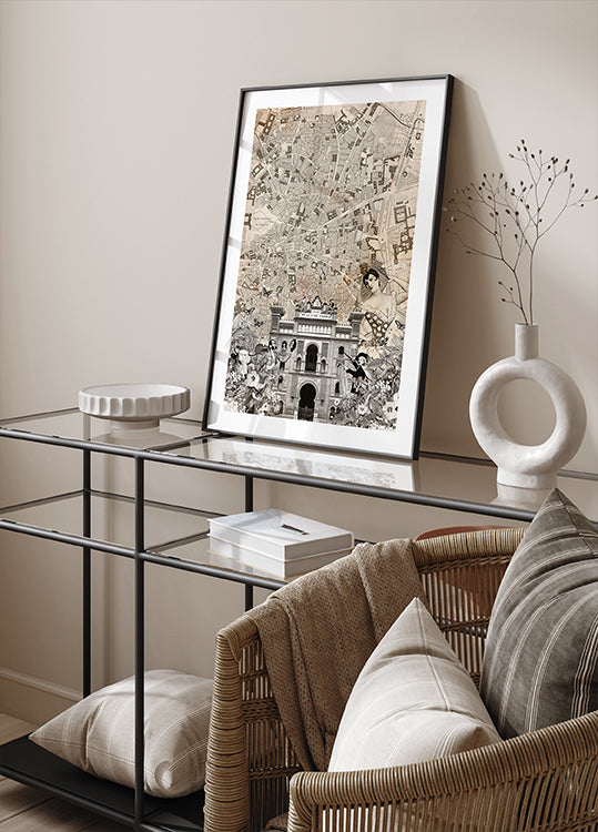 En stemningsfuld Madrid-plakat af Simon Goggin, der fanger byens puls i en retro collage. Et detaljeret bykort flettes sammen med ikoniske motiver som Plaza de Toros, matadorer og klassiske byscener. Varme, solmættede farver og grafiske former skaber en levende hyldest til Spaniens hovedstad. Perfekt til elskere af rejse, kultur og grafik.