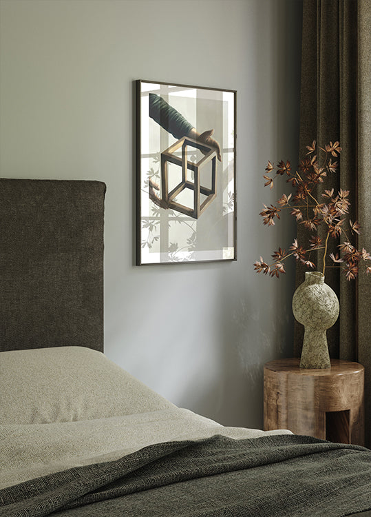 Yksinkertainen ja kiehtova taidejuliste, jossa on mahdoton kuutio. Lämpimät sävyt ja optinen illuusio luovat jännittävän visuaalisen paradoksin rauhallisessa ilmaisussa.
