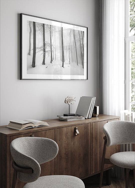 Hiljainen talvimaisema avautuu sumussa ja pakkasessa, jossa sirot pyökin rungot seisovat graafisina viivoina hillityssä, lumisessa metsätilassa. Valo suodattuu pehmeästi sumun läpi ja luo meditatiivisen katseenvangitsijan, joka vangitsee puiden välisen rauhallisuuden. Tom Pavlasekin runollinen luontovalokuva. Täydellinen talvitunnelmaan kotiin.