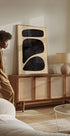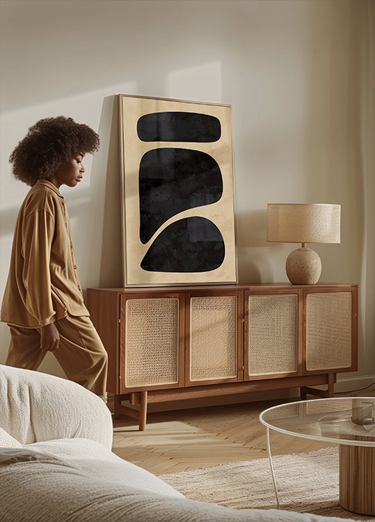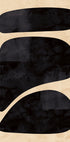 Tyylikäs abstrakti taideteos, jossa on kolme silmiinpistävää mustaa muotoa pinottuina lämpimää beigeä taustaa vasten. Minimalistinen koostumus ja kuvioitu pinta lisäävät modernin ja hienostuneen vaikutelman – täydellinen gallerian seiniin, olohuoneeseen tai skandinaaviseen sisustukseen.