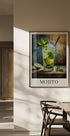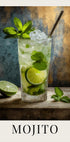 Eloisa taideteos, jossa on klassinen mojito-cocktail mintunlehtiä, limettiviipaleita ja olkia jäällä täytettyyn lasiin. Teksturoitu tausta korostaa raikasta ja virkistävää tunnelmaa, joka on täydellinen juomisen ja cocktailtaiteen ystäville.