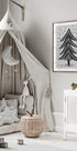 Monochrome Pinefall indfanger vinterens stille poesi: en alene, stiliseret fyr rejser sig mod en blød, grå himmel, mens fine snefnug falder som et roligt slør. De skarpe sorte streger og den enkle komposition skaber et moderne, grafisk udtryk, der emmer af hygge, ro og tidløs julestemning. Motivet balancerer naturens styrke og stillhed.