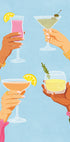 Eloisa ja värikäs kuvitus, joka juhlii ystävyyttä ja iloa. Neljä kättä nostaa cocktaillasinsa iloisessa kulhossa kirkkaansinistä taustaa vasten, täynnä lämpöä, positiivisuutta ja yhteisöllisyyttä – täydellinen moderniin keittiöön, baariin tai olohuoneeseen.