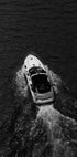 Tyylikäs huvivene leikkaa läpi tumman veden jyrkässä kontrastissa, ylhäältä kuvattuna hienostuneena yksivärisenä. Tämä minimalistinen aihe juhlistaa vapautta, tarkkuutta ja liikkeen estetiikkaa – ihanteellinen moderniin sisustukseen, jossa on tyylitajua ja rauhallisuutta.