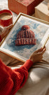 Mieleenpainuva talvikuva neulotusta tupsulla varustetusta hatusta hiljaisessa lumisateessa - pieni hetki viihtyisyyttä, lapsuuden rauhallisuutta ja leikkisyyttä. Pehmeät muodot ja yksinkertainen aihe antavat mielikuvituksen vaeltaa, kun taas lumi vaimentaa ympäröivää maailmaa. Ohkimikon runollinen talvilook. Täydellinen tuomaan lämpimiä talvimuistoja kotiin.