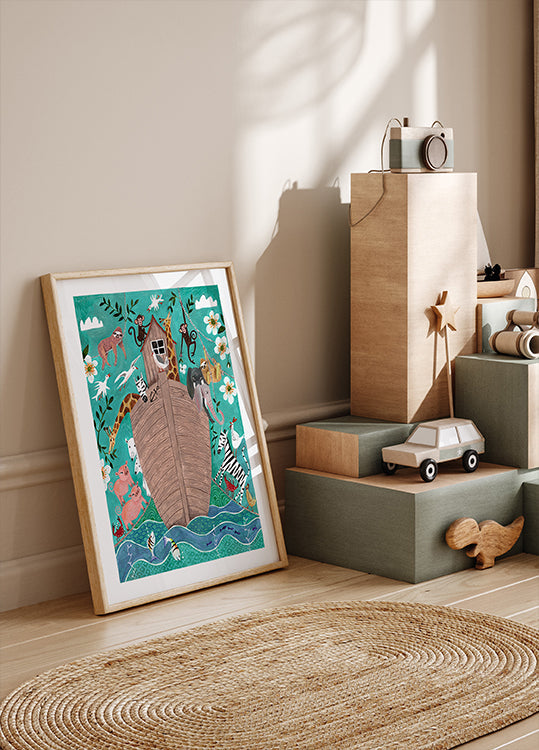 Leikkisä ja värikäs kuva Nooan arkista, joka on täynnä eläimiä, kuten kirahveja, norsuja, seeproja, apinoita ja lintuja. Rehevien kukkien ja eloisan veden ympäröimä tämä viehättävä taideteos vangitsee rakkaan Raamatun tarinan ilon ja mielikuvituksen. Täydellinen lastenhuoneisiin, lastentarhoihin tai kaikille, jotka rakastavat eläinkuvituksia.
