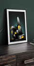 Odd shapes af Juan López Ruiz forener abstrakte former og arkitektoniske rytmer i en legende komposition. Grafiske lag og skarpe vinkler danser i varme gule nuancer med dristige kontraster, der antyder Madrids byrum. En moderne, farverig statement-plakat, der tilfører dynamik og personlighed til enhver væg.