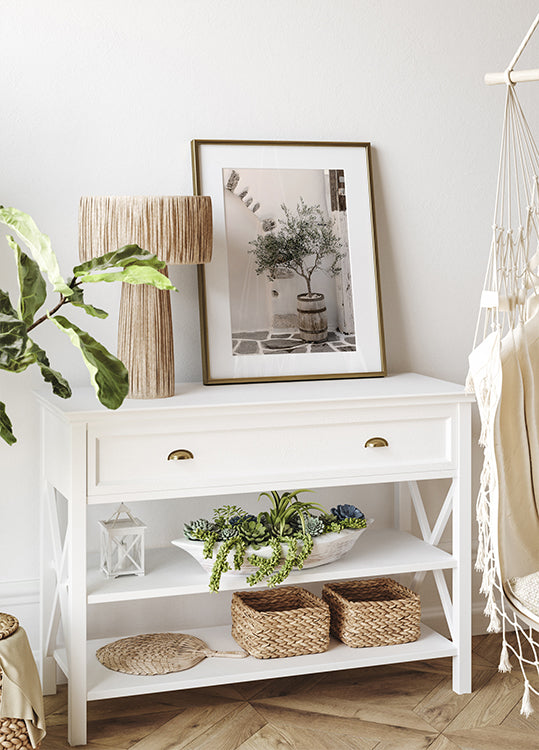Minimalistinen ja rauhallinen esitys maalaismainen oliivipuu, joka on istutettu puiseen tarjottimeen ja asetettu valkoiseksi kalkittua seinää vasten. Tämä taideteos korostaa Välimeren viehätyksen ajatonta kauneutta ja on täydellinen luomaan rennon ja luonnollisen ilmapiirin.