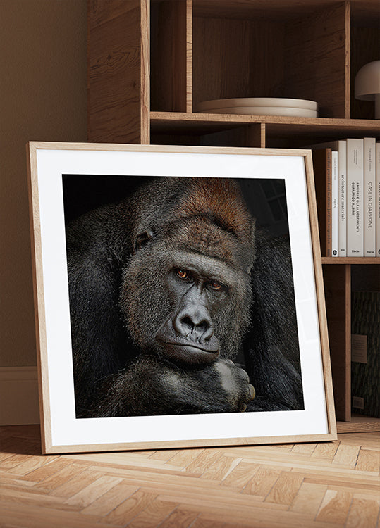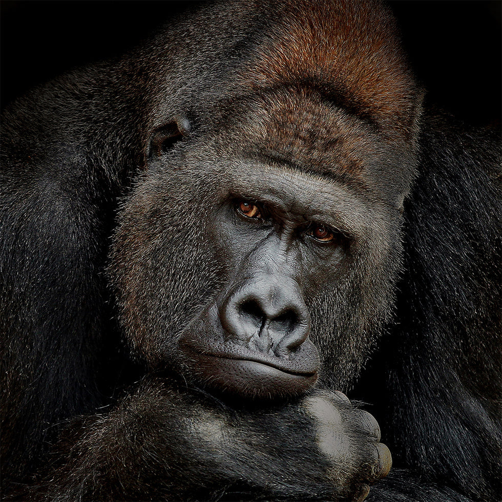 Intensiivinen, hillitty muotokuvajuliste majesteettisesta hopeanselkäisestä gorillasta, joka on kuvattu hiljaisen mietiskelyn hetkinä. Syvät, viisaat silmät kohtaavat sinun ja luovat läsnäoloa, haavoittuvuutta ja voimaa samanaikaisesti. Varjot korostavat ominaispiirteitä ja antavat aiheelle ajattoman veistoksellisen rauhan. Kirjailija: Antje Wenner-Braun Otsikko on ONE MOMENT IN COTACT.