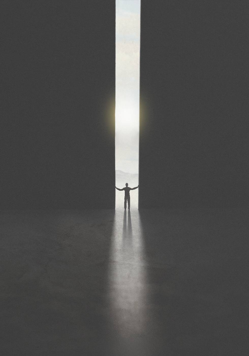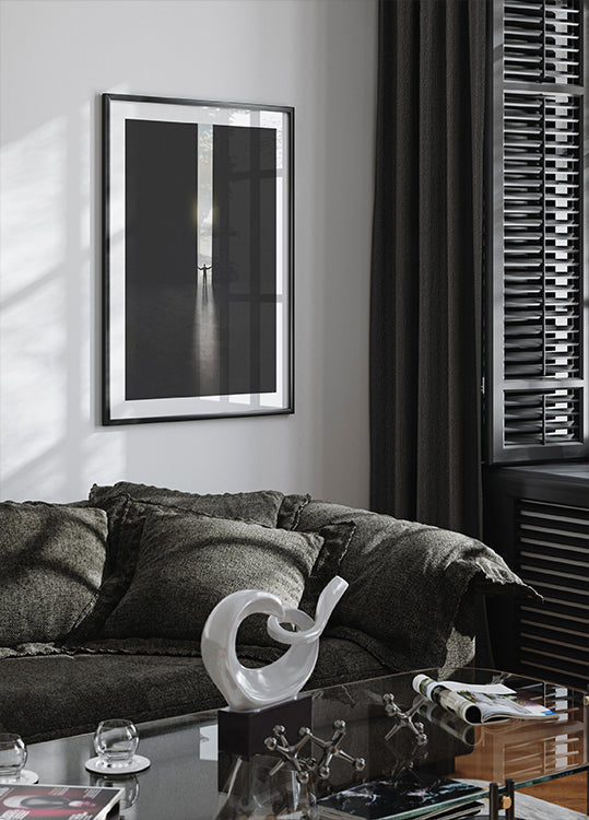 The Out of Darkness Poster* on voimakkaan surrealistinen taideteos, joka symboloi voimaa, toivoa ja uusia alkuja. Yksinäinen ihminen seisoo jättimäisen oven edessä, työntää pimeyden sivuun ja päästää valon sisään. Tämä minimalistinen mutta voimakas kuva edustaa esteiden voittamista, henkilökohtaista kehitystä ja askeleen ottamista kohti valoisampaa tulevaisuutta. Perfect for homes, offices, therapy rooms or as an inspirational gift.