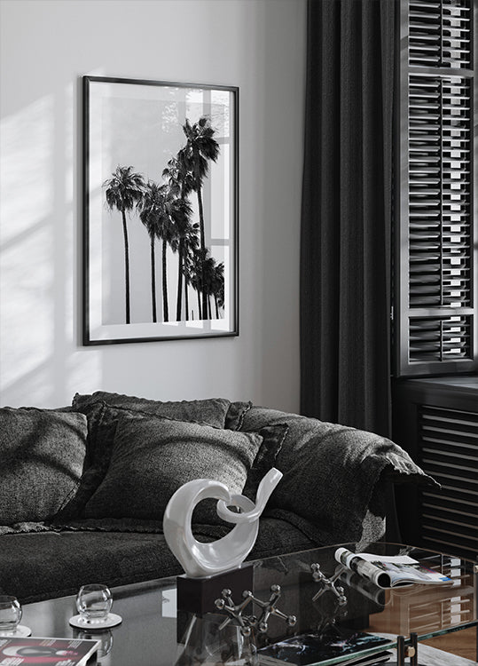 Tyylikäs mustavalkoinen valokuva korkeista palmuista, jotka heiluvat tuulessa. Minimalistinen ja ajaton muotoilu tekee siitä ihanteellisen moderniin ja rannikkoalueiden sisustukseen.