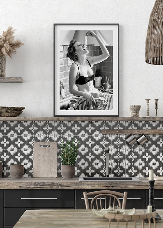 Leikkisä ja rohkea mustavalkoinen valokuva naisesta nauttimassa spagettia vintage-henkisessä keittiössä. Rento asenne, hän huokuu itseluottamusta ja huumoria, mikä tekee tästä taideteoksesta tyylikkään ja hauskan lisäyksen moderniin sisustukseen. Täydellinen keittiön sisustamiseen, ruokailijoille ja valokuvauksen ystäville.