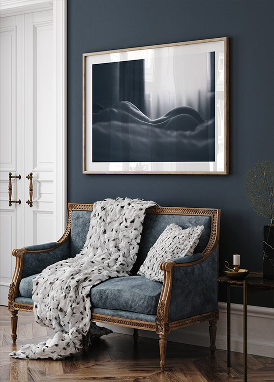 Tämä mieleenpainuva yksivärinen vartalomaisema vangitsee pehmeässä ikkunavalossa kylpevän naisvartalon aistilliset kaaret. Varjojen ja valon hieno vuorovaikutus korostaa figuratiivista eleganssia ja luo hienostuneen taideteoksen, jossa yhdistyvät intiimiys, aistillisuus ja taiteellinen hienostuneisuus.
