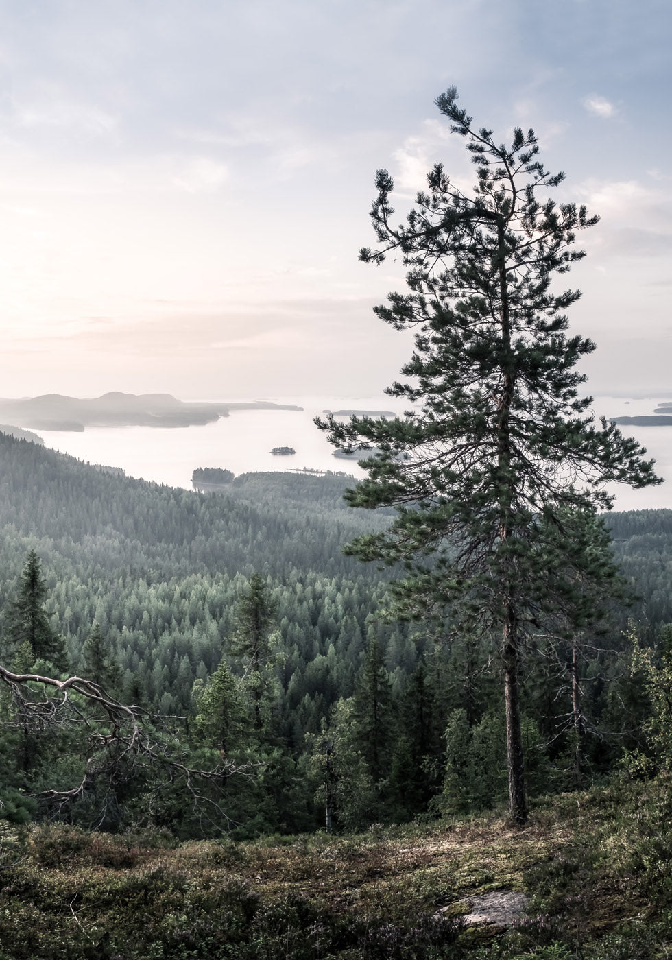 Seesteinen maisema, joka vangitsee pohjoismaisen metsän kauneuden suuren järven yllä. Etualalla seisoo yksinäinen mänty, ja loputtomat havupuukerrokset katoavat utuiseen horisonttiin. Pehmeän pastellisävyinen taivas korostaa rauhallista ja unelmoivaa tunnelmaa, mikä tekee tästä taideteoksesta täydellisen lisän luontoaiheiseen sisustukseen.