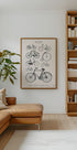 Yksityiskohtainen mustavalkoinen kuva vintage-pyöristä vuosilta 1871–2007. Tämä nostalginen taideteos vangitsee polkupyörän historian, ja siinä on ikonisia malleja, kuten Kenwood, Columbia ja Grand Bi. Täydellinen kotiin, pyöräkauppoihin tai lisäämään retro charmia gallerian seinälle.