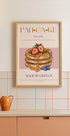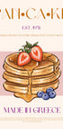 Viehättävä vintage-tyylinen juliste, jossa on pino pörröisiä pannukakkuja, joiden päällä on mansikoita, mustikoita ja kultaista siirappia. Tässä retrotypografialla ja pastelliväreillä suunnitellussa taideteoksessa yhdistyy ruokanostalgia ja tyylikäs sisustus, ja se sopii täydellisesti keittiöön, kahvilaan tai aamiaisen ystäville.