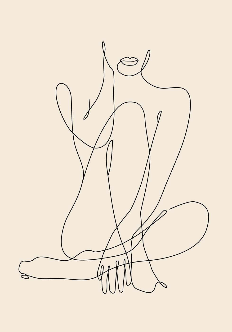 Elegantti ja taiteellinen yksiviivainen piirros istuvasta naisesta, joka ilmentää naisellista kauneutta ja minimalistista tyyliä. Yksinkertaiset mutta ilmeikkäät linjat luovat modernin ja hienostuneen ilmeen, joka sopii täydellisesti moderniin ja skandinaaviseen sisustukseen.