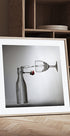 Kaatamalla? Wieteke de Kogelin käsitteellinen asetelma, jossa vinossa oleva pullo näyttää kaatavan vettä viinilasiin leikkisässä optisessa illuusiossa. Sävellys tasapainoilee rauhan ja jännityksen välillä puhtailla linjoilla, pehmeillä heijastuksilla ja arkisella kohtauksella, joka muuttuu runoliikkeeksi. Täydellinen moderneille seinille.