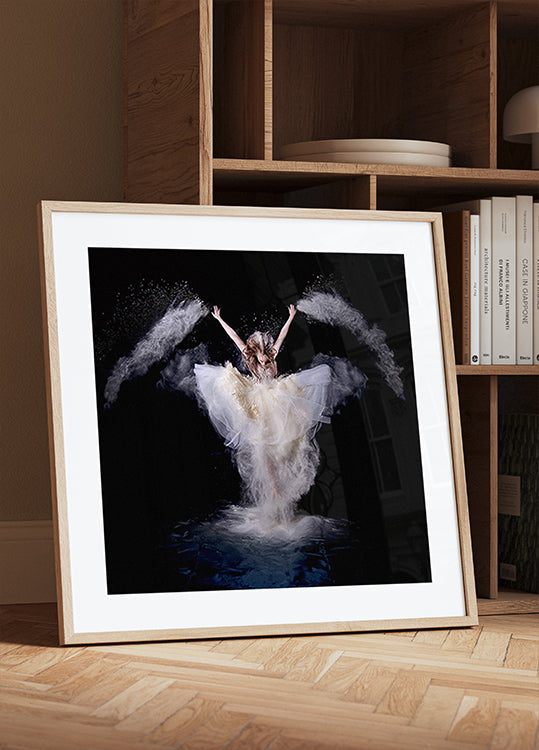 Pauline Pentonyn Powder Rush vangitsee hetken, jolloin tanssija räjähtää liikkeelle enkelin kaltaiset siivet muodostavan puuteripilven ympäröimänä. Tumma, dramaattinen tausta kohottaa kirkasta hahmoa, kun taas hyppy, mekko ja höyhenen pölyttäminen luovat runoutta, voimaa ja seikkailua. Moderni, seikkailunhaluinen muotokuva.