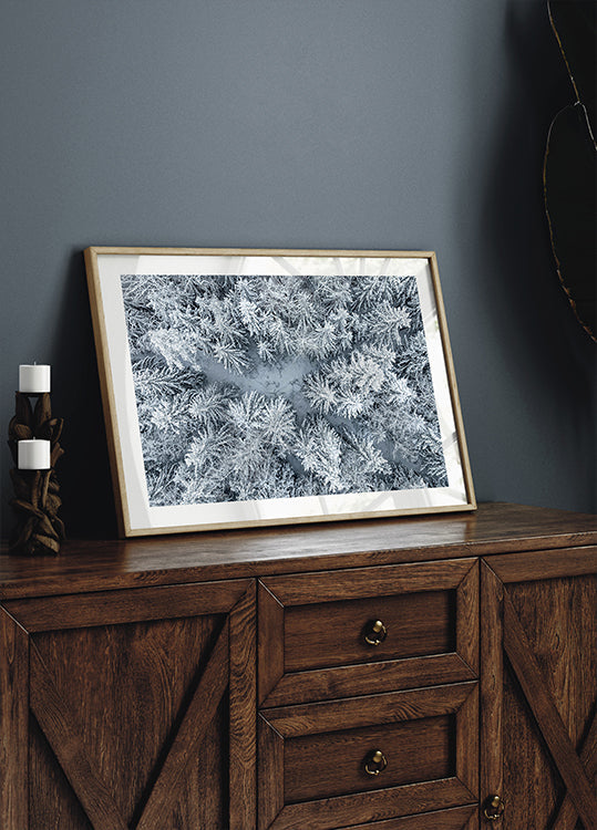 Hiljainen talvitunnelma avautuu hillityssä metsässä, jossa lumi peittää pehmeän peiton puiden tummien siluettien päälle. Sumu ja haaleat sinisen sävyt luovat rauhallisuutta ja syvyyttä, kun taas valon jäljet vievät katseen maisemaan. Runollinen, pohjoismainen tunnelma – Margus Vilisoo luoma. Täydellinen talvisille seinille ja rauhallisuudelle huoneessa.
