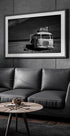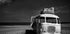 Mieleenpainuva mustavalkoinen valokuva hylätystä vintage-bussista hiekkarannalla. Katolle pinottu kuluneet matkalaukut ja taustalla meri, kuva ilmaisee hylättyjä matkoja, rappeutumista ja ajan kulumista.