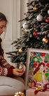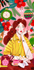 Lämmin, retro joulukohtaus: Hymyilevä punatukkainen nainen raidallisessa puserossa nauttii höyryävästä teestä kimaltelevan joulukuusen vieressä, joka on täynnä koruja ja seppeleitä. Lumi kiiltää ikkunassa, värit vaaleanpunainen ja männynvihreä luovat nostalgiaa. Caroline Bonne Müllerin kodikas, vuosisadan puolivälin inspiroima kuvitus. Täydellinen talvikäyttöön.