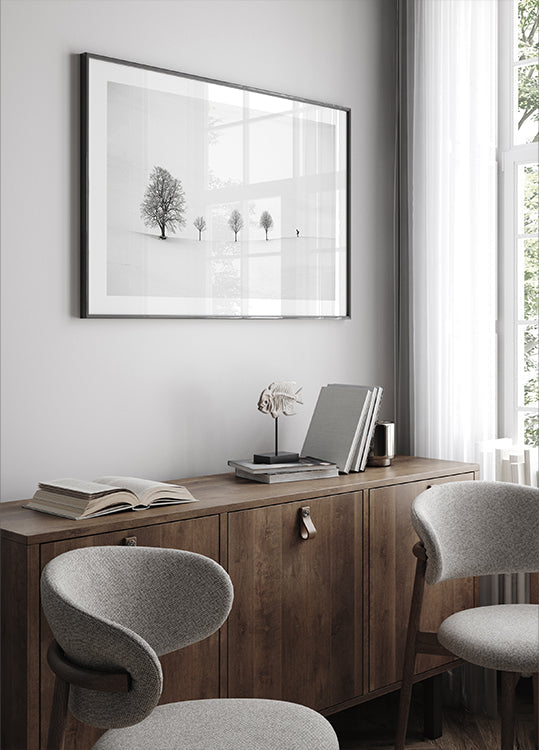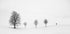 Et grafisk, højkey vintermotiv af Peter Svoboda MQEP: En enlig skiløber skærer spor i en næsten hvid, sneklædt bjergside, mens få mørke træer og konturer tegner en minimalistisk kontrast. Den monokrome komposition emmer af ro, kulde og fokus – et poetisk øjeblik i bevægelse. Motivet balancerer tomrum og struktur i et strengt, grafisk udtryk.