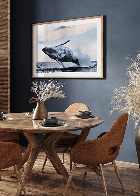 Henkeäsalpaava valokuvajuliste, jossa ryhävalas murtautuu dramaattisesti valtameren pinnan yläpuolelle. Voimakas hyppy, joka jää ilmaan roiskuvan veden kera, osoittaa luonnon majesteettisen voiman. Täydellinen eläinten ystäville, merimaisemien ystäville ja niille, jotka rakastavat vaikuttavia luonnon ihmeitä.