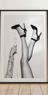 Tyylikäs mustavalkoinen muotivalokuva, joka vangitsee korkokenkiä, samppanjaa ja leikkisää eleganssia. Minimalistinen kontrasti luo rohkean juhlatunnelman, joka on täydellinen moderniin sisustukseen ja muodista inspiroituun seinätaiteeseen.