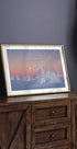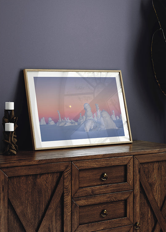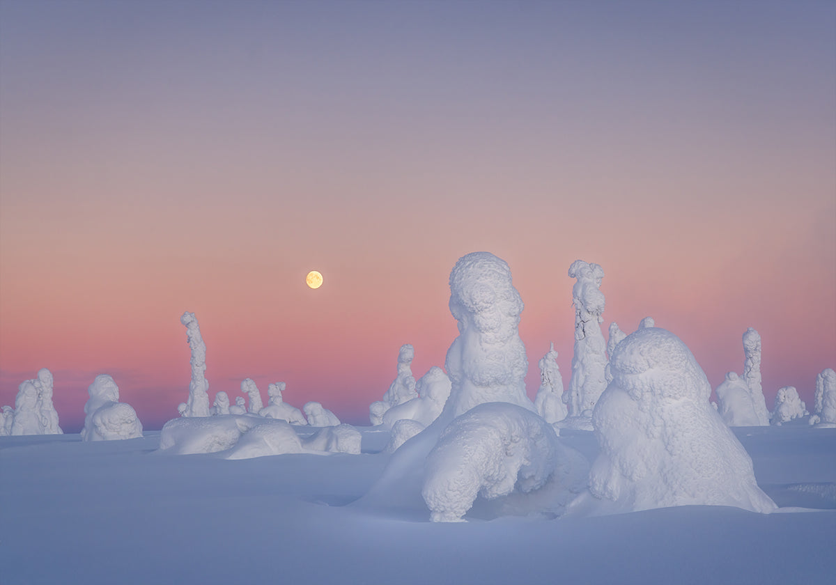 Tämä kuva näyttää maagisen talvimaiseman, joka kylpee pehmeissä pastellisävyissä auringonnousun tai auringonlaskun aikaan. Lumi on peittänyt puut niin kokonaan, että ne seisovat lähes veistoksellisina, mielikuvituksellisina hahmoina hajallaan jäässä. Taivaan värit vaihtuvat vaaleanpunaisesta laventeliin, ja kirkas, valoisa kuu roikkuu matalalla horisontin yläpuolella, mikä antaa kohtaukselle unenomaisen ja melkein sadunomaisen ilmeen. Kaikki näyttää hiljaiselta, jäätyneeltä ja äärettömän rauhalliselta – kuin maailmasta, jossa ei ole aikaa.