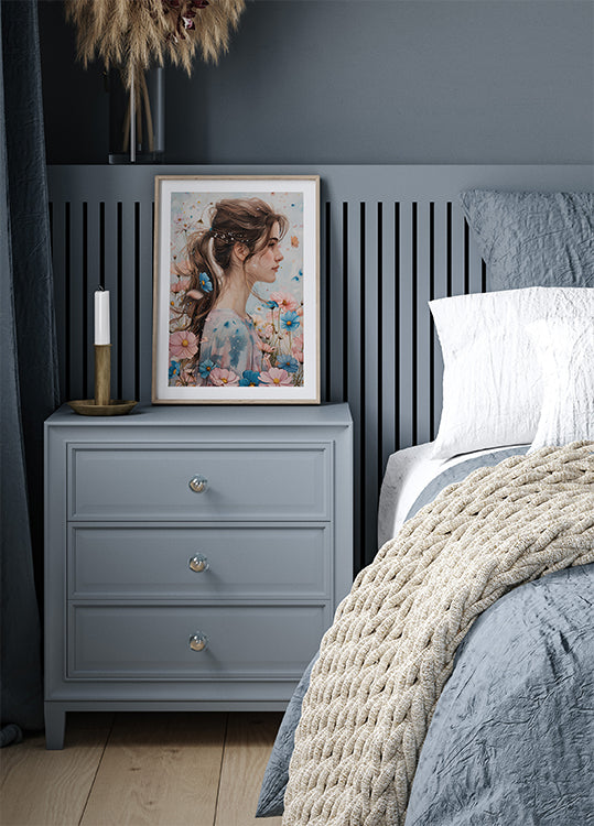 Unelmoiva vesiväritaideteos seesteisestä nuoresta naisesta, jota ympäröivät pastellivärisissä kukkissa kukkivat kukat. Herkät perhoset ja kelluvat lehdet herättävät rauhallisuuden ja mietiskelyn tunteen, jotka sopivat täydellisesti harmonisen ja inspiroivan tunnelman luomiseen.