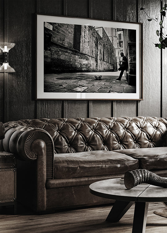 Mieleenpainuva mustavalkoinen kaupunkikuva: yksinäinen saksofonisti kaataa jazzia kapealle Barcelonan kadulle, parvekkeille ja tiiliseinille kehystämään taloa. GertJan van Geerenstein vangitsee urbaanin yksinäisyyden hiljaisen pulssin, jossa varjot, perspektiivi ja viipyvät nuotit muuttavat kujan näyttämöksi. Elokuvamainen hiljaisuus leijuu ilmassa.