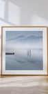 Jose Beutin sininen hiljaisuus vangitsee hiljaisen hetken sumuisen vuoristojärven rannalla. Yksinäisen kalastajan siluetti seisoo rauhallisesti vaaleansinistä hehkua vasten, kun taas heijastus kristallinkirkkaasta vedestä kaksinkertaistaa hiljaisuuden. Pehmeät, pastellisävyt ja minimalistiset linjat luovat pohjoismaisen, meditatiivisen tunnelman ja rauhan tunteen.
