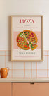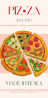 Tässä retrohenkisessä taideteoksessa on värikäs kuva viipaloidusta pizzasta erilaisilla täytteillä, kuten oliiveilla ja pepperonilla. Vuonna 1979 perustettu teksti "PIZZA" korostaa tuoretta, kotitekoista taikinaa ja aitoa italialaista alkuperää.