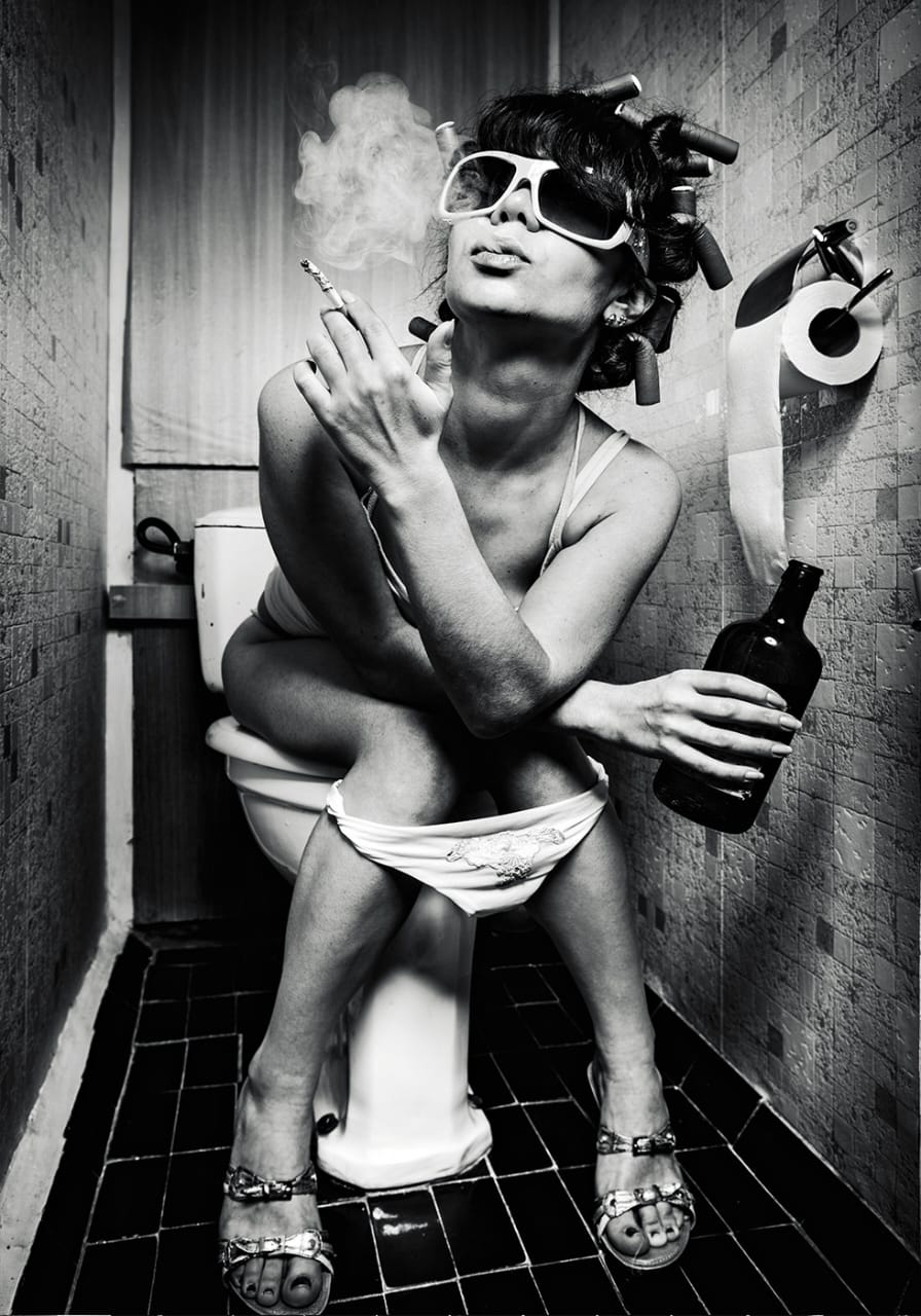 Vaikuttava mustavalkoinen valokuva, joka yhdistää huumoria ja rohkeutta. Kuvassa on nainen vessassa vintage-kihartimissa, ylisuurissa aurinkolaseissa ja itsevarmassa asenteessa. Hän pitelee savuketta ja pulloa, jotka symboloivat uhmakasta itseilmaisua. Tämä leikkisä ja epätavanomainen taideteos sopii täydellisesti eklektiseen sisustukseen tai niille, jotka arvostavat omituisia ja kapinallisia kuvia.