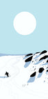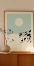 Nicholasin Snowy Mountain Descent kuvaa yksinäisen hiihtäjän kiirettä, joka leikkaa puuteria pitkin rauhallisia, graafisia vuorenrinteitä. Minimalistiset sinisen ja valkoisen sävyt, matala talviaurinko ja puhtaat linjat luovat modernin, rauhallisen ilmapiirin retro-ski-tunnelmalla ja pohjoismaisella yksinkertaisuudella. Täydellinen seikkailun tunteen ja visuaalisen rauhallisuuden herättämiseen kotona.