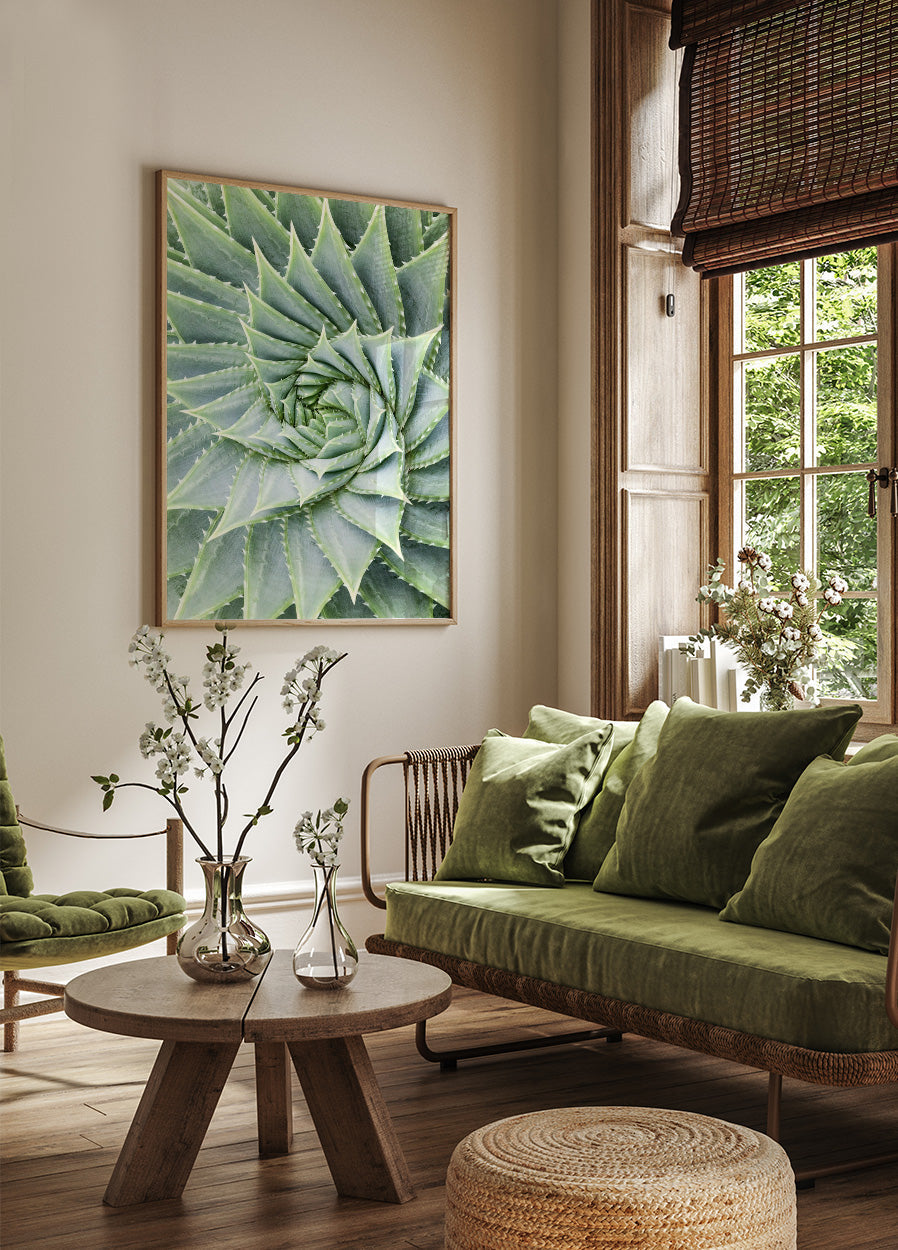 Julisteessa on lähikuva aloe vera -kasvista, jonka vihreät lehdet ovat spiraalimaisesti rakennettuja. Teräväkärkiset lehdet lähtevät säteilevästi keskeltä luoden visuaalisen kuvion, joka korostaa kasvin luonnollista symmetriaa ja rakennetta. Värit ovat pehmeitä ja hillittyjä, mikä antaa rauhallisen ja orgaanisen ilmeen.