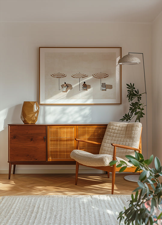 Rauhallinen ja yksinkertainen kuva, jossa on kolme raidallista aurinkovarjoa ja kaksi ihmistä aurinkotuoleissa kirkkaalla rannalla. Hillityt värit ja rento sommittelu luovat kesäisen rauhan ja välimerellisen tunnelman. Täydellinen kesämökeille, moderneihin koteihin tai gallerian seinille.