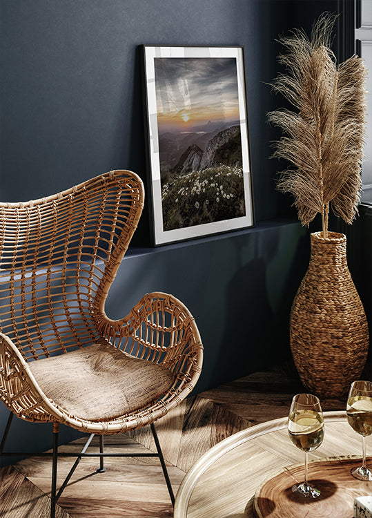 Auringonnousu vuoren yli villikukkien juliste