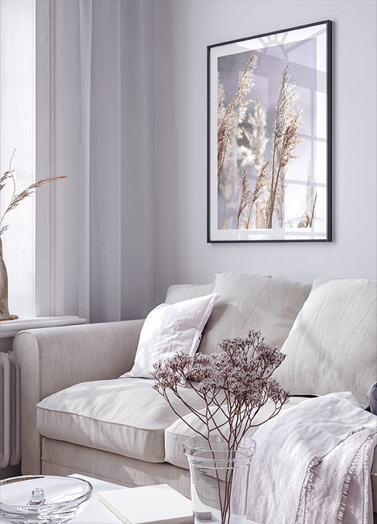 Rauhallinen luonnonmaisema, jossa hienot pillit heijastavat auringonlaskun valoa. Neutraalit värit ja pehmeät kontrastit luovat rennon ja ilmavan tunnelman mihin tahansa huoneeseen.