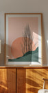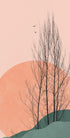 Rauhoittava minimalistinen maisema, Auringonlasku Serenity vangitsee luonnon hiljaisen kauneuden hämmästyttävällä yksinkertaisuudella. Ohut, herkät puiden siluetit kohoavat suurta, lämmintä oranssia aurinkoa vasten, jota kehystävät pehmeät, kumpuilevat vihreät kukkulat ja vaalea persikkainen taivas. Kaksi pientä lintua leijuu yläpuolella, mikä lisää rauhaa ja avoimuutta. Tasapainoinen koostumus ja hillitty väripaletti tekevät tästä kappaleesta täydellisen moderniin, skandinaaviseen tai japanilaiseen sisustukseen ja luo rauhallisen keskipisteen mihin tahansa huoneeseen.