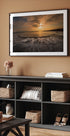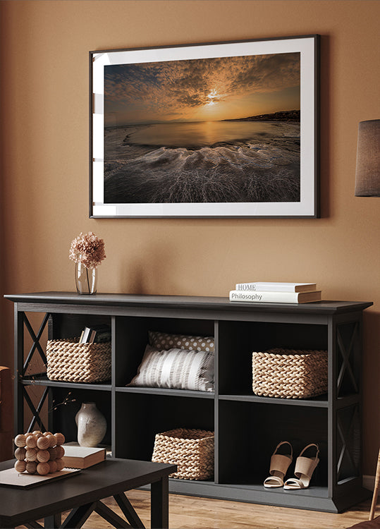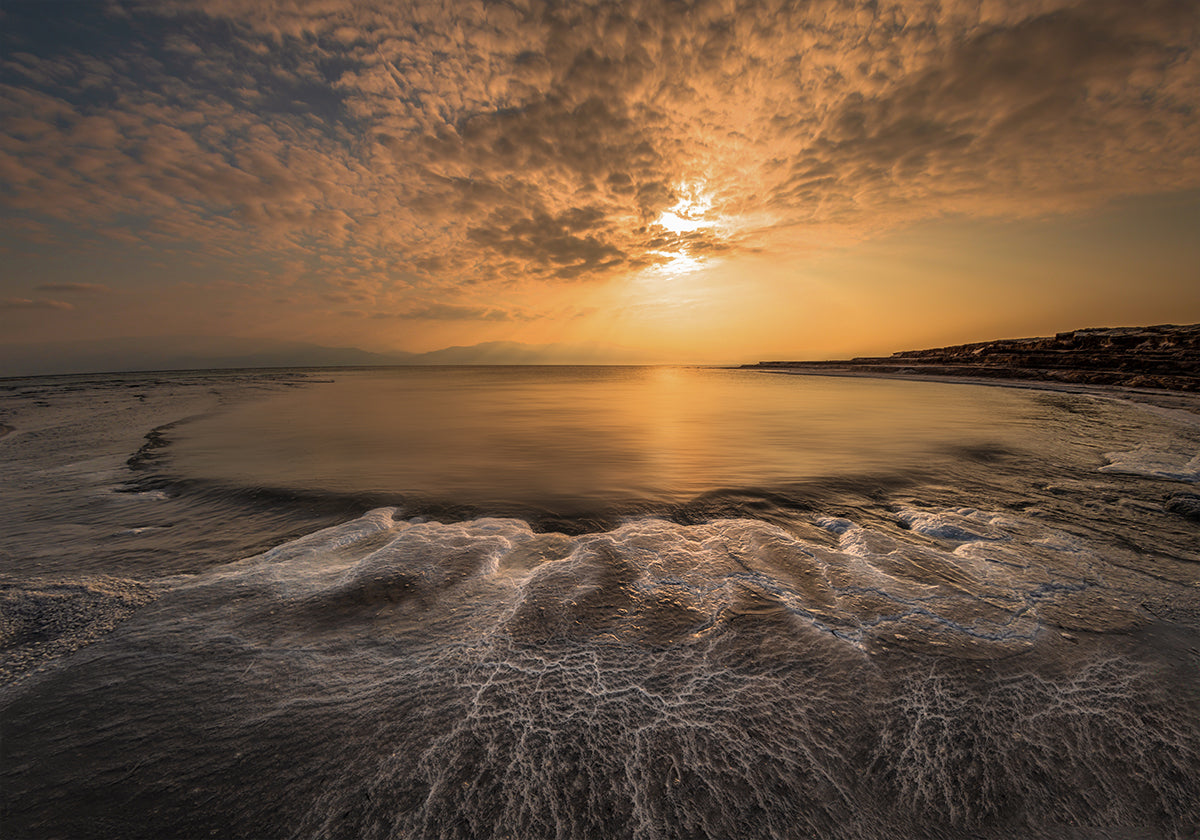 Isam Telhamin Suolarakenne antaa meren hiljaisen rytmin täyttää tilan: pehmeät aallot huuhtoutuvat hienon, kevyen hiekkarannan yli, jossa suola piirtää hienovaraisia kuvioita pitkin veden reunaa. Horisontin yli ajelehtivat raskaita pilviä vaimennetun sinisen ja hiekan väreissä. Rauhallinen, minimalistinen motiivi, joka kutsuu miettimään.