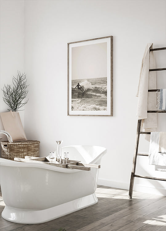 Upea seepiasävyinen valokuva surffaajalta, joka leikkaa aaltojen läpi täydellisesti. Meren liike ja dynaaminen vesiroiskeet luovat seikkailun ja vapauden tunteen. Ihanteellinen surffaajille ja rannikon inspiroimaan sisustukseen.