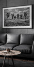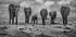 Karu mustavalkoinen villieläinvalokuva norsulaumasta vaeltelemassa Afrikan savannilla. Kuva vangitsee sekä voimaa että hellyyttä ja symboloi perhettä, suojelua ja yhtenäisyyttä luonnossa.