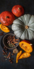 Maalaismainen syksyn asetelma kurpitsalla, kanelitangoilla, muskottipähkinällä, kardemummalla ja tähtianiksella. Tämä lämmin ja kodikas koostumus vangitsee syksyn sadon olemuksen ja vuodenajan maut, ja se sopii täydellisesti keittiöön ja juhlallisiin joulukoristeisiin.