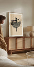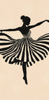 Siro musta siluetti baleriinasta piruetin keskellä, raidallinen mekko leijuu elegantissa liikkeessä. Pehmeä beige tausta ja voimakas kontrasti antavat tälle kappaleelle ajattoman, tyylikkään tunnelman – täydellinen lisäämään taiteellista liikettä olohuoneeseen, studioon tai gallerian seinään.